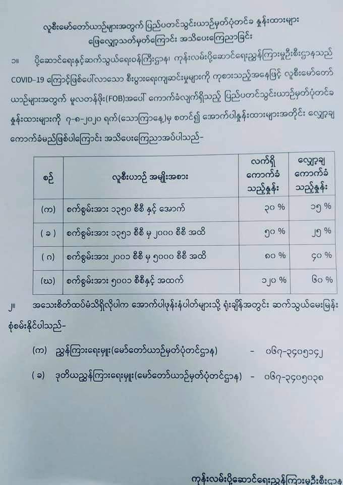 ၁။ ပို့ဆောင်ရေးနှင့်ဆက်သွယ်ရေးဝန်ကြီးဌာန၊ ကုန်းလမ်းပို့ဆောင်ရေးညွှန်ကြားမှုဉီးစီးဌာနသည် COVID-19 ကြောင့်ဖြစ်ပေါ်လာသော စီးပွားရေးကျဆင်းမှုများကို ကုစားသည့်အနေဖြင့် လူစီးမော်တော် ယာဉ်များအတွက် မူလတန်ဖိုး(FOB)အပေါ် ကောက်ခံလျက်ရှိသည့် ပြည်ပတင်သွင်းယာဉ်မှတ်ပုံတင်ခ နှုန်းထားများကို ၇-၈-၂၀၂၀ ရက်(သောကြာနေ့)မှ စတင်၍ အောက်ပါနှုန်းထားများအတိုင်း လျှော့ချ ကောက်ခံမည်ဖြစ်ပါကြောင်း အသိပေးကြေညာအပ်ပါသည်-